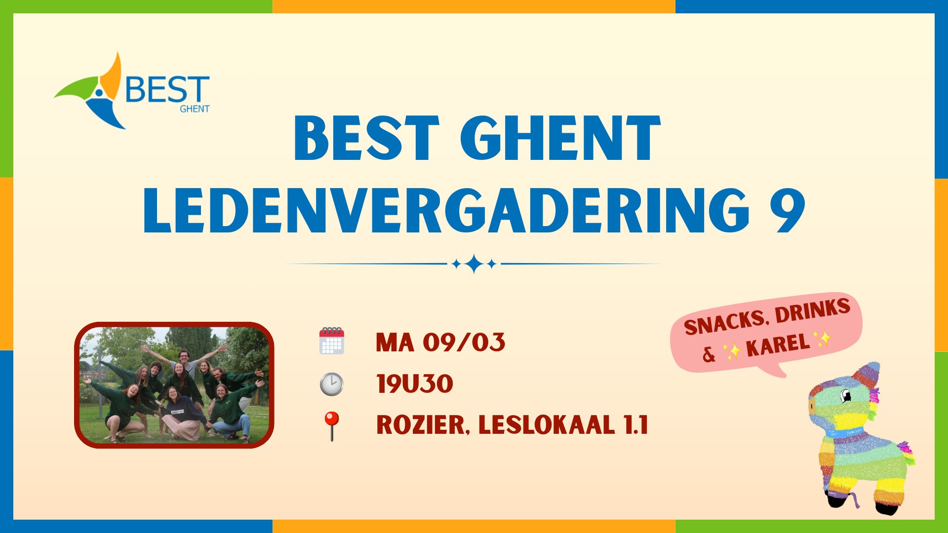 Dit is de 9de ledenvergadering van BEST, deze vindt plaats in leslokaal 1.1 in het Roziergebouw, om 19u30. Iedereen is zeker welkom, ook als je nog niets van BEST afweet! Mocht je met vragen zitten, contacteer ons dan zeker ([email protected]).