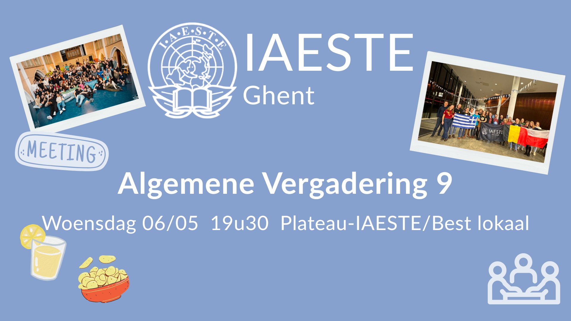 Allen aanschouw! De negende vergadering van IAESTE MET GRATIS PIZZA! Deze vindt plaats in studentenlokaal VTK Groen op 11 maart om 19u30.